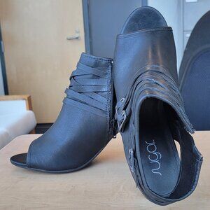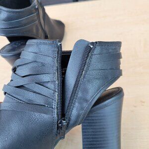 As fall comes around, every girl needs their black boots or booties. Here, this item is a peep-toe ankle bootie with wrap around straps. Featuring a 3 hole adjustabity on the buckle straps. As well as a zip up closure type for easy taking off or on. This piece isn't just tied to the fall, its use can be found during the summer or autumn.