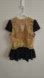 Chic blouse with intricate gold lace overlay. Classic black base. Short sleeves and scalloped edges.