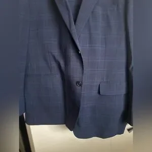 48L Tommy Hilfiger navy suit with subtle check pattern. Pants are 44 waist, hemmed to 30 length but can be let out. Includes 2 shirts - 1. Calvin Klein 2xl 18 collar white shirt with light grey and yellow dot pattern. 2. Joseph Abboud 17.5 neck blue grid pattern. Everything recently dry cleaned. Both shirts match the suit. Purchased from Moores for over 700 dollars.