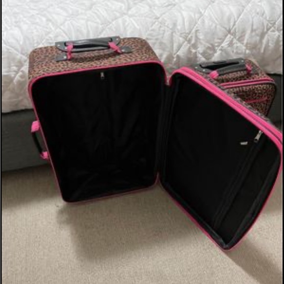 Rockland Leopard Print 3 Piece Suitcase Set. Has been used but still are in great condition in the smallest and medium ones there’s a few small rips in the upper netted part but nothing horrible.
