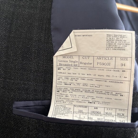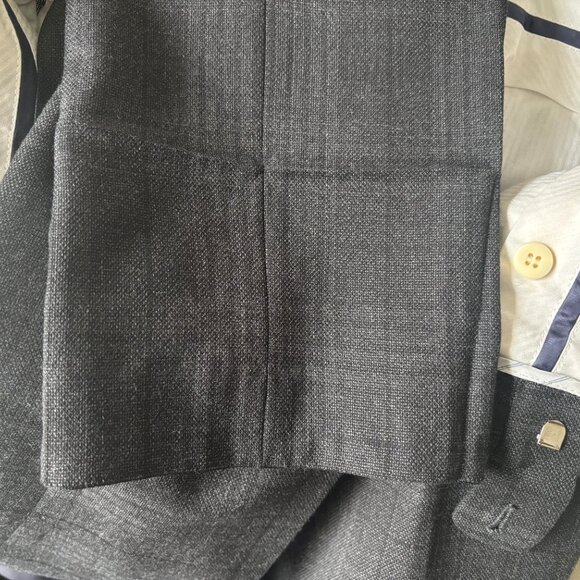 The fabric is a 100% wool grey plaid from Carlo Barbera. The jacket is double vented with a notch lapel and flap pockets. Features surgeon's cuffs (working buttonholes).