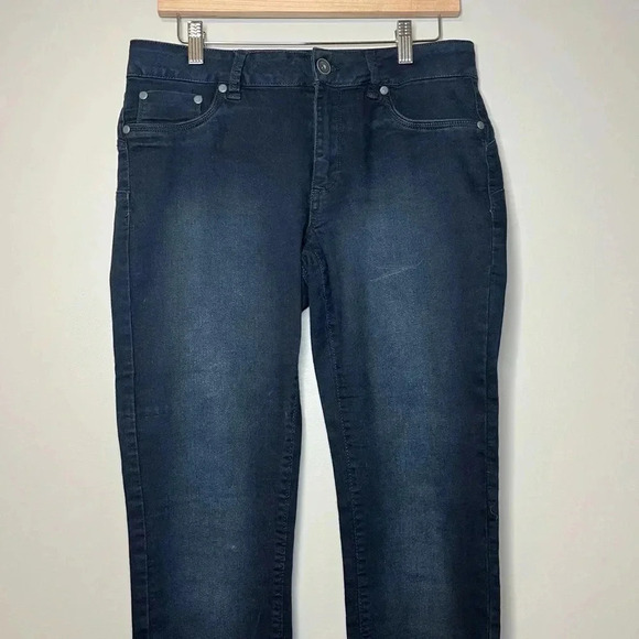 Excellent condition. Faded dark wash. Lightweight denim - cotton/ poly/ spandex blend. Zipper fly. Five pocket style.