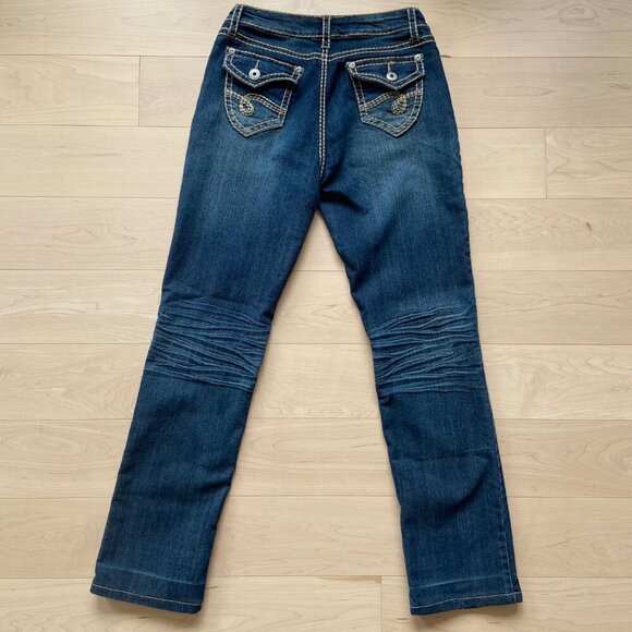 Item keywords: Suko Jeans, mid-rise jeans, blue denim, contrast stitching, women's jeans, size 8, straight leg pants, stretchy denim, casual wear, embroidered jeans, button and zip, comfortable fit, flap embroidered pockets, Roadrunner Apparel, bohemian, urban western, casual streetwear, hobo, bohemian, urban cowgirl, relaxed