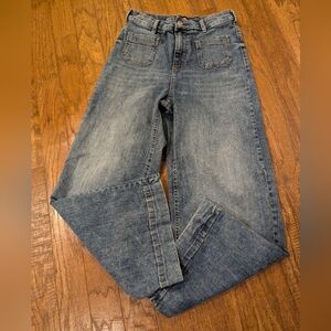 Stylish wide-leg denim jeans. Classic blue color. Perfect for casual wear.
