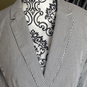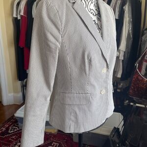 Talbots blazer in black and white stripes. Very versatile and in excellent used condition. Worn only a few times. Blazer has a polkadot lining with red piping on the inside. Slightly fitted blazer with three real button holes at the cuffs.