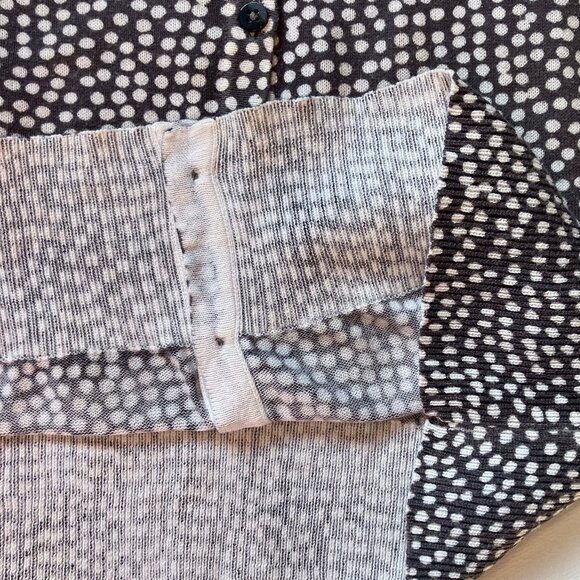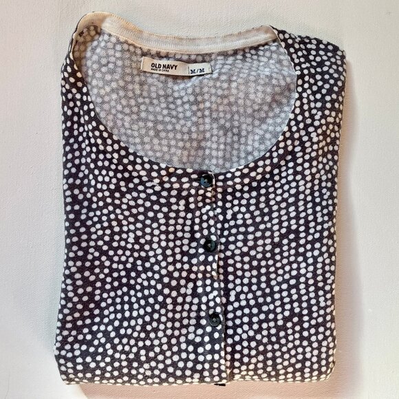 Old Navy size medium, cotton, 3/4 length sleeves, charcoal grey with white dots. This is more of a t-shirt than a sweater - it's easier to pop it over your head than to undo the tiny buttons. Good condition but not perfect - but oh so cute!