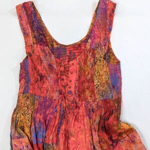 Blended cotton /rayon patch work tye die. The entire dress is made from a patch work of squares sewn together with french seams. Lace-up smocked bodice can be worn either way. Pockets. Coral, magenta, red.