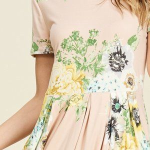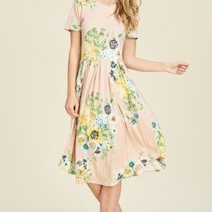 Gorgeous bold floral printed midi dress featuring front pleated skirt, flowy round hemlkine and a side pocket