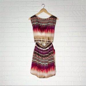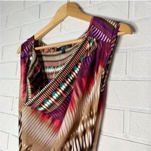 Lightweight summer dress with cut out back. Elastic wasteband. Cowl neckline. Vibrant colours. In good condition. Worn twice. Easy care and machine washable. Great dress but too small for me. Fits like a US M.