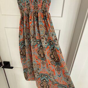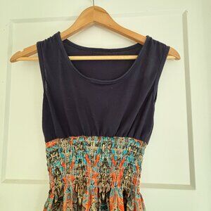 No tags, but extra-small size - has give though as the top is a soft knit, and the bottom a parachute silk material. Very cute on - fitted at the top, and really flowy skirt. I'm 5'5" and it site below my knees.
