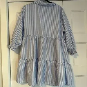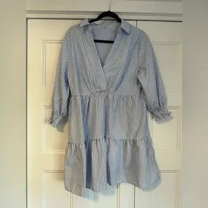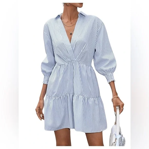 Blue and white striped V-neck dress with a flattering fit. Perfect for any occasion.