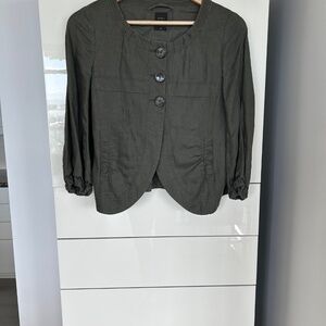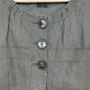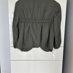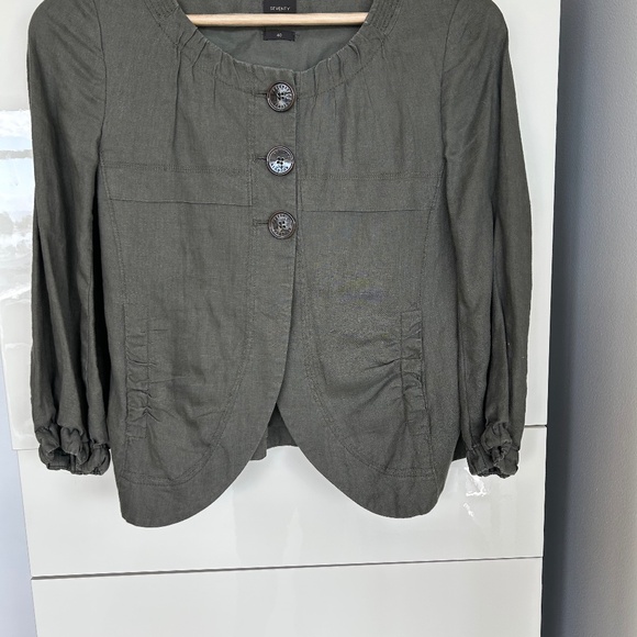 100% faux linen ,three quarter sleeve ,three buttons , crew neck , gathered back, faux pockets,
