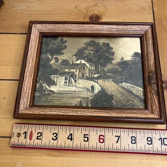 Vintage set of 2 gold-tone foil art prints with two different landscape scenes: a summer grist mill riverside scene, and a winter farmyard scene. Paper art prints are framed under glass, wood frames are approx. 7 1/2" tall x 9 1/2" wide. Good pre-owned condition: wood frames have a few marks/indents from display/storage. The metal hanger on the back of one frame has some rust.