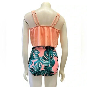 Swimsuit, coral top / green and coral printed high waisted bottom Bikini Set with tummy control, double adjustable straps on top with removable chest padding. Considerable amount of stretch in top and bottom.