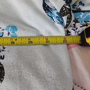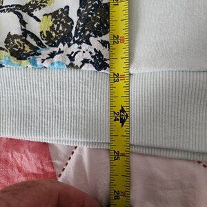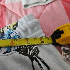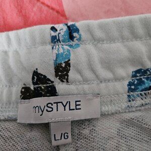 Very pretty set made of a cotton/poly blend. Very soft and comfortable. In excellent used condition. Shorts have some stretch but only about an inch.
