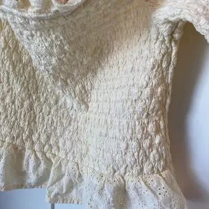 Yellow off-the-shoulder top with shirting and eyelet ruffle details.