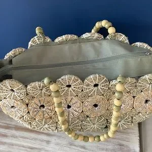 Hay and wood summer bag bought in italy length 30 cm, width 50cm, handle 60 cm. very good condition.
