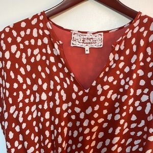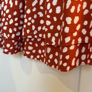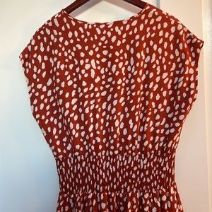 Burnt orange cheetah print dress. Layered. Soft. Loose fit on top. Elastic, cinch waist.