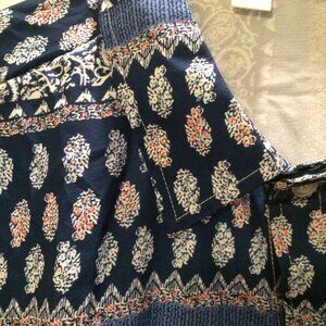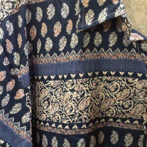 Men's summer short sleeve shirt, soft silky feel, 65% cotton and 35% nylon, multi print in blue, white, cream, and burgundy.