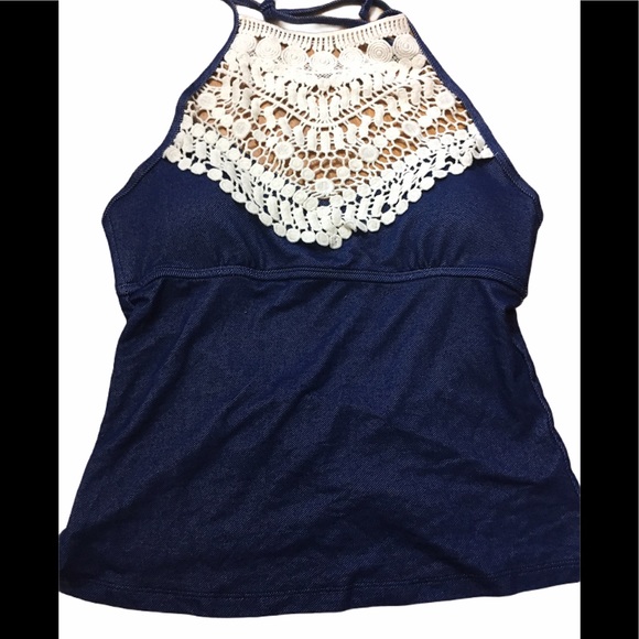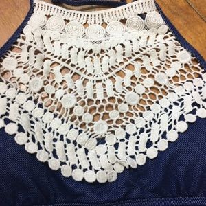Oh so cute crochet at the top, straps and strap around back cotton. Removable breast pads