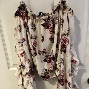 Off the shoulder top with long ruffled sleeves that open at the end.