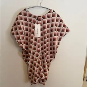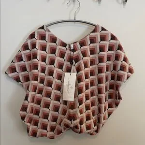 Stylish geometric design. Features red, pink, and cream tones. Last picture shows how it will look when worn - naturally blouses itself!