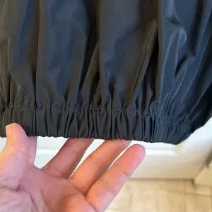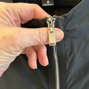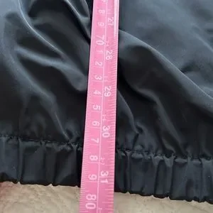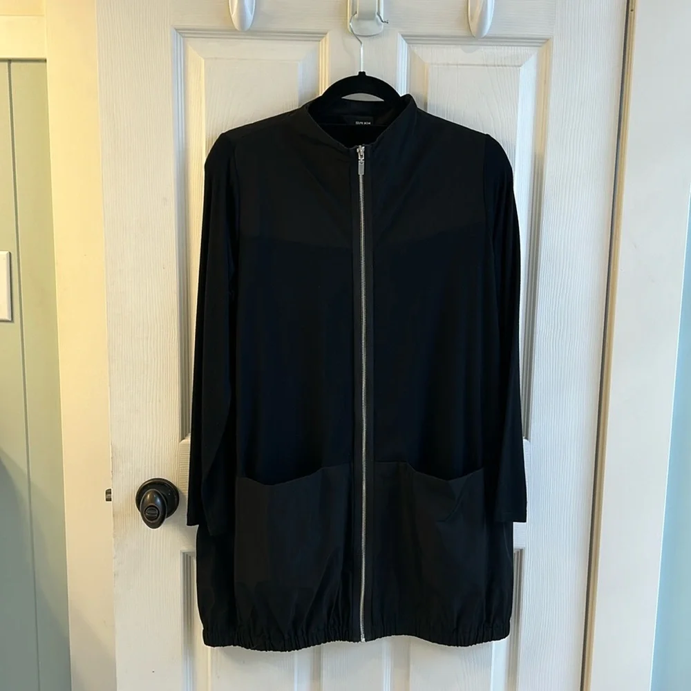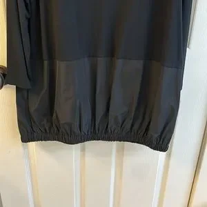 A mix of parachute fabric and a tee shirt feeling jersey keep this piece interesting. Big deep front pockets. Beefy zipper that allows you to wear as a tunic or a cardi. Elastic on the lower hemline holds shape and creates a flattering silhouette. Great travel piece, just roll and go. In excellent condition.