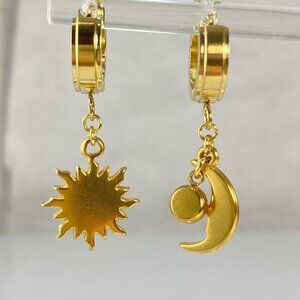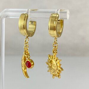 These handmade stainless steel earrings feature sun and moon charms combined with birthstones. One earring has a sun charm and the other has a moon charm with a birthstone. We can also make the earrings without the birthstone. It's totally up to you.