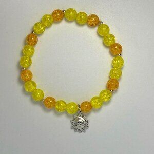 Shine bright with this fun and bright glass-beaded bracelet. This bracelet features: bright and golden yellow glass beads, gold spacers and is finished off with a silver sun, engraved on the back of this sun it quotes " made with a smile." Perfect add on to any outfit.