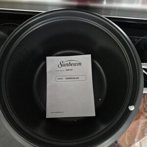 Sunbeam One-touch cook and warm operation. Includes removable nonstick inner pot. Stackable steaming insert for vegetables. Secure glass lid with handle.