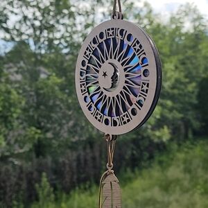 Handmade suncatcher featuring a sun, moon, and stars design. Laser cut wood and recycled CDs.