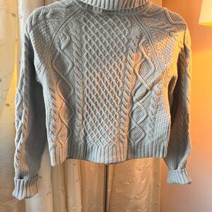 Sunday Best baby blue cable knit sweater in excellent condition. Front zipper make sit easy to get on and the rolled neckline looks very nice on. Very cozy sweater.