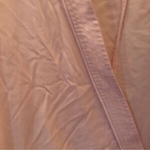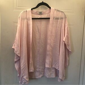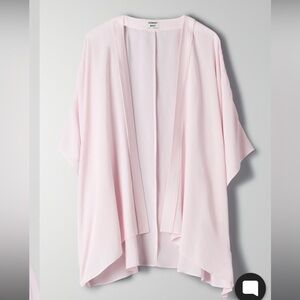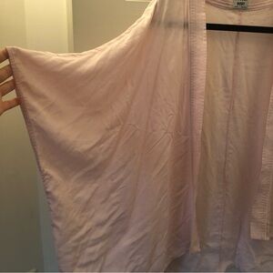 This is a short kimono with slit sleeves and a hem that hangs slightly longer at the back. It's made with a lightweight fabric that drapes nicely.
