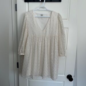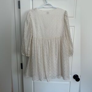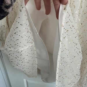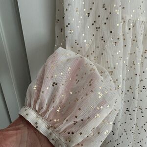 Elegant cream dress with shimmering gold accents. Features a flattering V-neckline and long sleeves. Perfect for special occasions.
