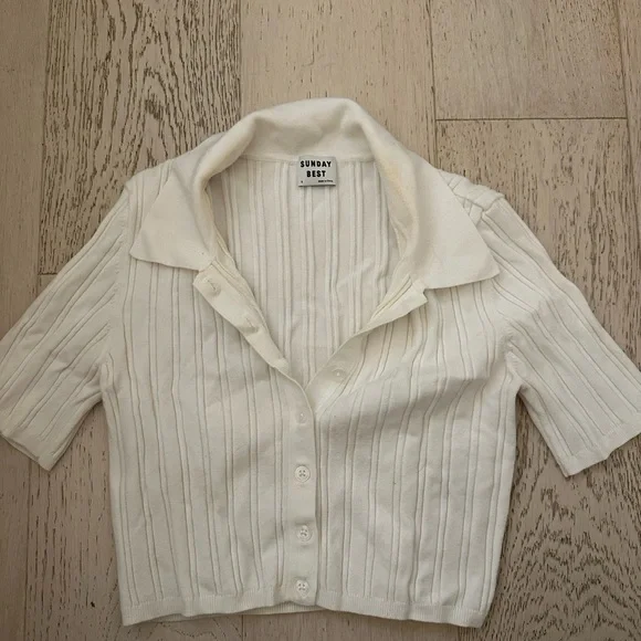 Elegant cream ribbed knit with a classic collar. Perfect for layering.
