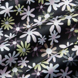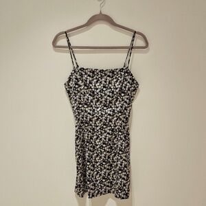 This is a mini dress with a straight neckline and princess seams for shaping. It’s cut from lightweight stretch satin with a subtle sheen. This version comes in an exclusive floral print that was designed in-house.