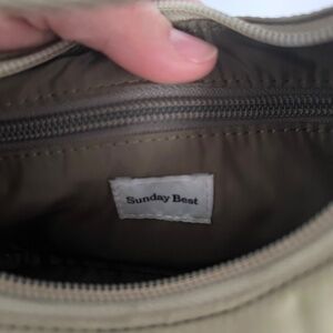 This is the Sunday Best goldie bag in Sage green. It has an inner pocket and closes with a zip.