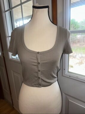Size small. Sunday Best. Grey ribbed crop top with short sleeves and scoop neckline. Front button-down detail for easy styling. Stretchy knit fabric for a snug, flattering fit. Pairs well with high-waist jeans or skirts.
