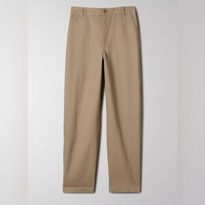 high-rise utility chinos with a straight waistband and darts for shaping. They're made from brushed cotton twill