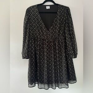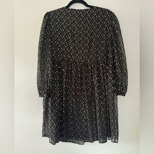 This is a long-sleeve, V-neck mini dress with gathered sleeves and a relaxed babydoll fit. It's made with a foil-printed crinkle fabric.