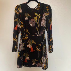I am so broken-hearted that this dress doesn't fit me anymore. It made me feel so so pretty. Long sleeve, with a slight puff and subtle lace details on the bodice and hem. The all-over forest animal print is GORGEOUS. Perfect for parties, weddings or date night. Fits close to the torso with a defined waist and then skims the hips. Skirt is lined. 100% polyester, no stretch.