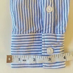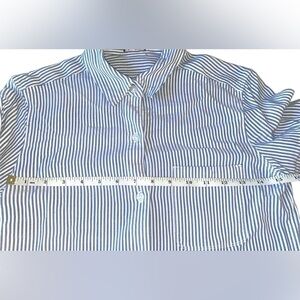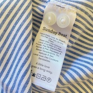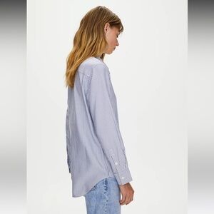 This is a menswear-inspired shirt with faux-shell buttons, pleat details and a breast pocket. It’s made with soft, drapey twill fabric. This version of the Montana is striped.