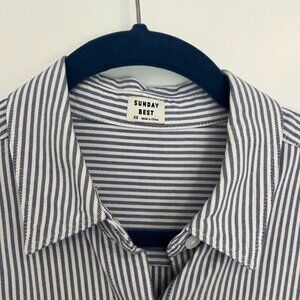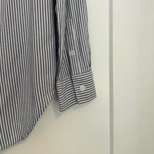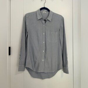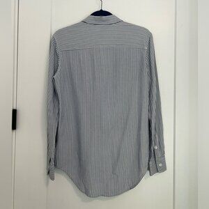 This is a menswear-inspired shirt with faux-shell buttons, pleat details and a breast pocket.