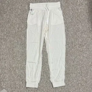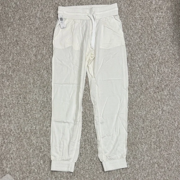 Relaxed-fit jogger pants with elastic waistband and functional drawstring. Soft knit fabric for easy movement. Ribbed ankle cuffs and side pockets. Clean off-white tone for versatile styling.