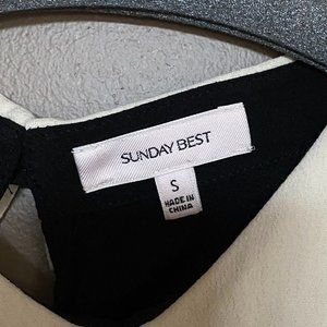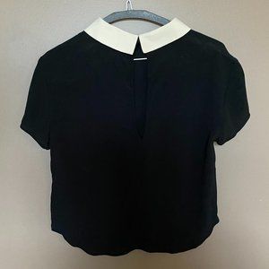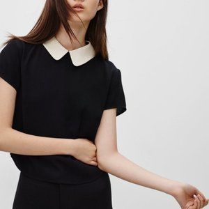 Slightly cropped, Sunday Best lightweight smooth black blouse with cream-colored classic collar.