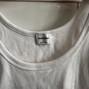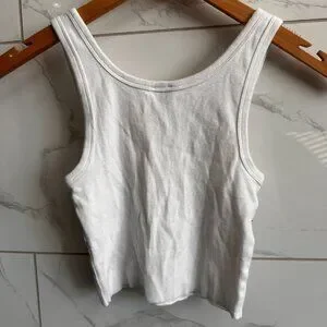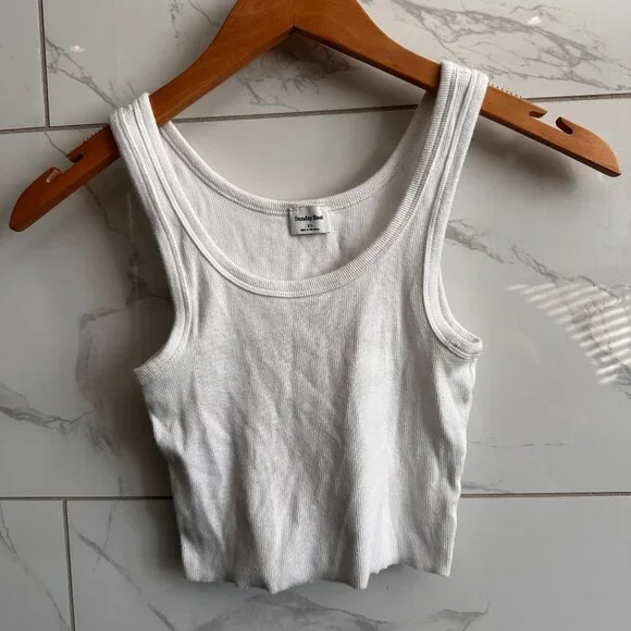 Sunday Best ribbed cropped tank size XS white stretch cotton rib scoop neck thick straps raw hem fitted basic layering piece light wash wear good condition.