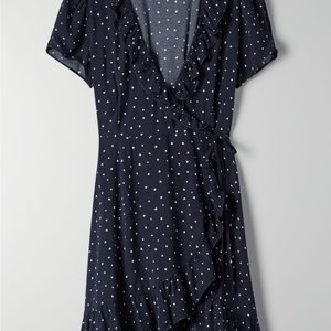 Mini-wrap dress in navy blue with small hearts. Very cute and flattering dress.