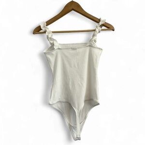 This ribbed white bodysuit is in NEW condition it has cute ruffled straps. Ideal for stylish outings.