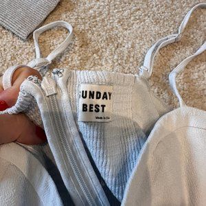 This is a bustier-style midi dress with a thigh slit, adjustable straps and a smocked back panel. It’s made from drapey crepe fabric with a subtle pebbled texture.