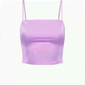 This is a square-neck camisole with adjustable straps, a smocked back panel and princess seams for shaping. It's made from lightweight stretch satin with a subtle sheen.